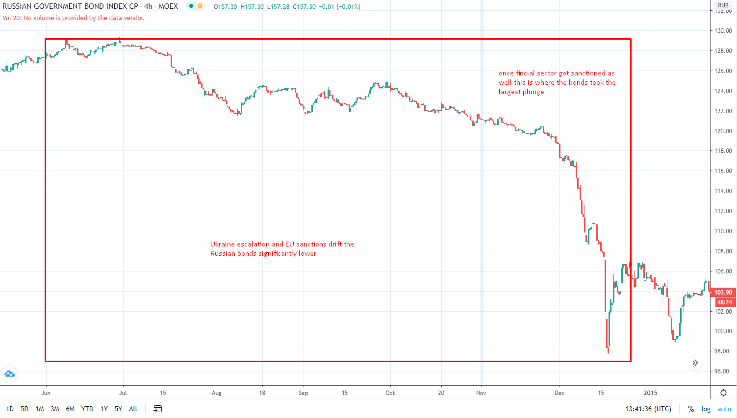 Russian bonds in the mid of 2014 escalation. Since Russia is not highly indebted to the outside international partners the bonds took relatively late response and only took a real hit once financial sector within Russia got sanctioned as well, which meant that currently borrowed international debt could no longer be expanded by large sums and the bonds reacted (tightening).