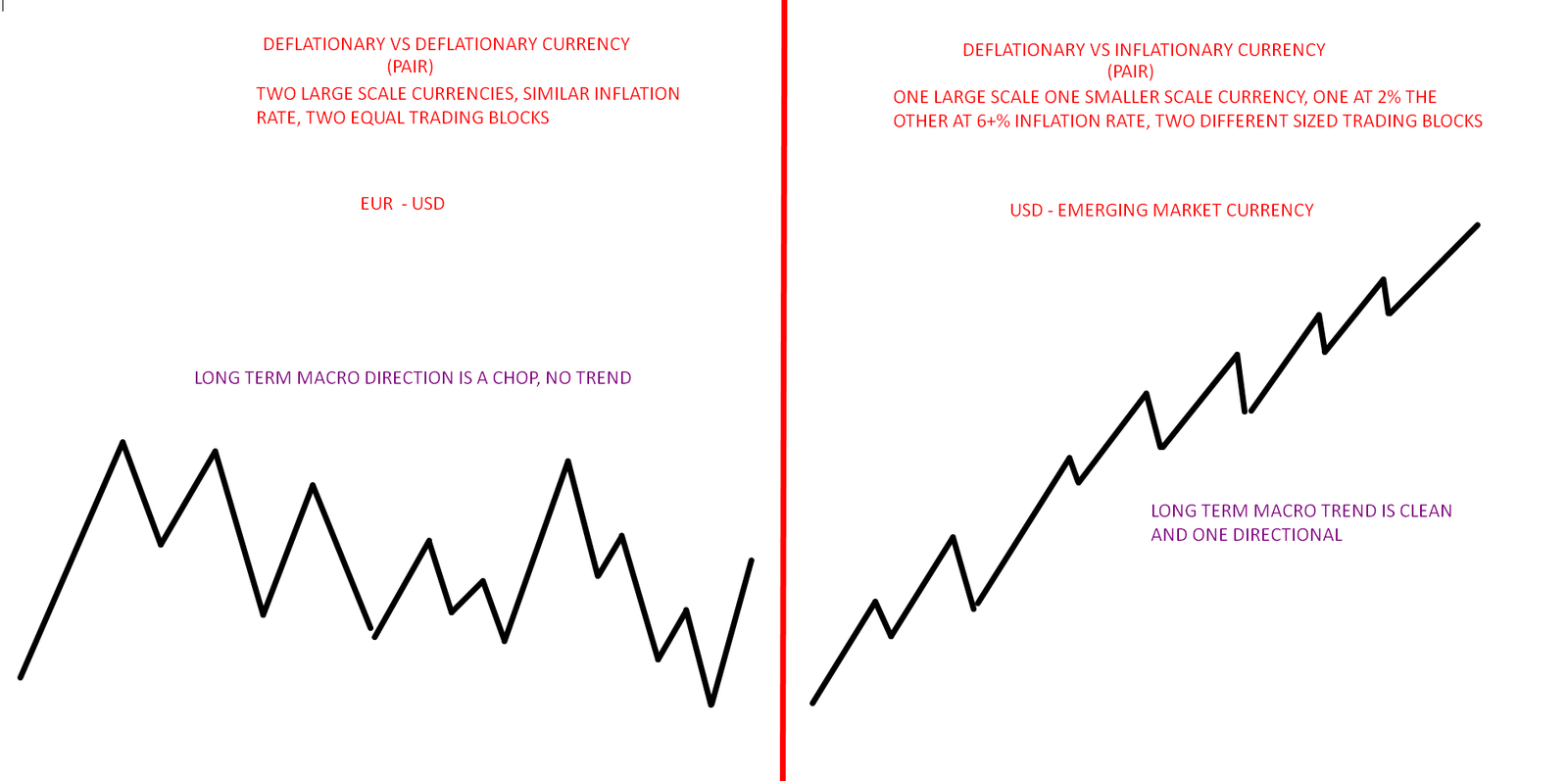The main focus of macro trader should be picking the right assets that fit best and clearest possible conditions to base trades upon over a long duration of time. And for this, a currency pair needs to have the right counterpart currencies bulked together within a pair. Two economies/markets that are in opposite forces of inflation/deflation or growth/decline or other factors at which the general strengths are measured but the variances should be very clear. The wider the gap between two economies and their currencies the better a that has ability to create very one directional move on the FX pair. The smaller the gap and the more even the economies are the more difficult it might be to pick direction on such pair, resulting in choppy range.