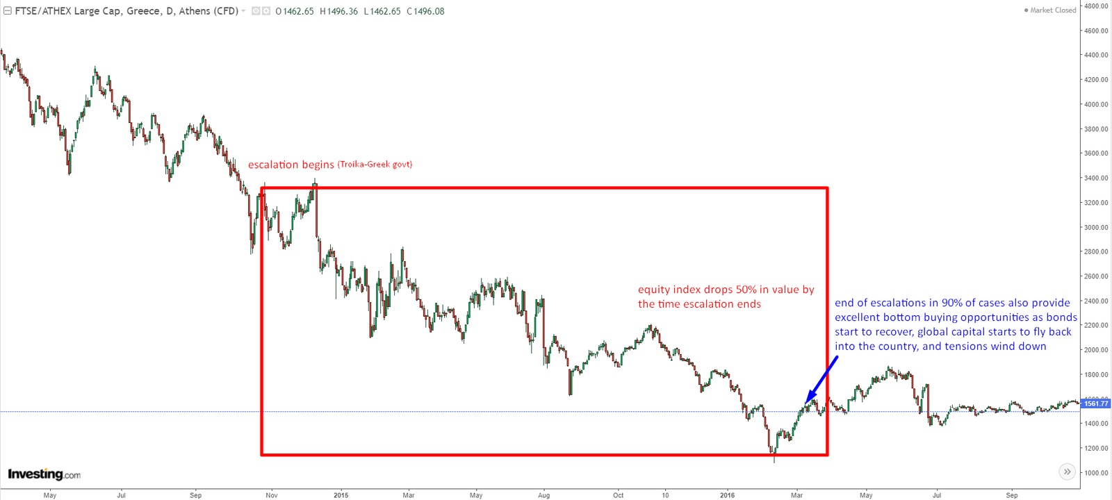 The point being that as a macro trader if one has view on why conflict might start, or what is the real purpose and strategic reason why it started in the first place, it can provide a huge long-lasting view on where the currency of such country or countries tied in conflict might go. Usually (statistically) super-powers are not impacted much on currency, the only country in which currency suffers is the one where the conflict is taking place. And especially in the modern era of financial markets, currencies of external countries can be used as aggressive tools to speed up capital outflows from such an impacted country, as it was present in the Syrian conflict by use of Jordans artificial currency propping to fuel the drop of Syrian currency.