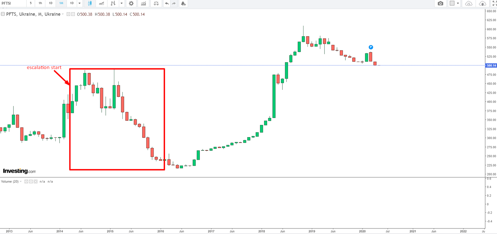 Ukraine equity index on image below. One thing to note, when there is an escalation it matters a lot how resilient the economy is to escalation and how much of the economy remains operational, as well as how much of international capital was present in the country before the escalation started. The more international capital present, the larger the outflows will be (as this capital tends to leave the country the quickest when things start to turn sour), while if there if the economy is rather more isolated to itself the drop in equity index might not be that strong, even if the country is militarily weak. This is an important factor to gauge which equity indexes are more or less likely to take a hit when it comes to this.