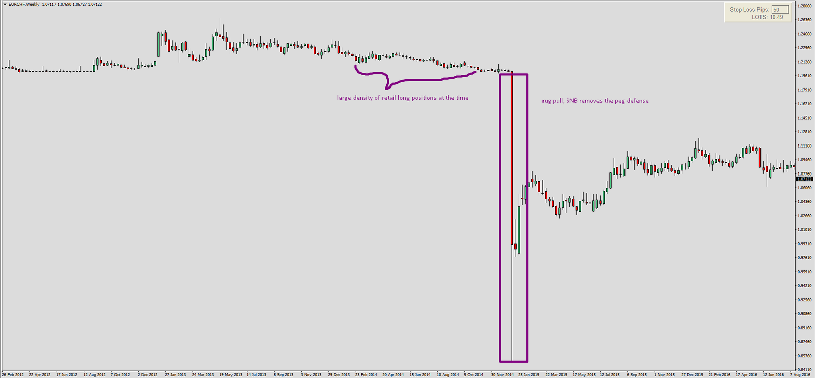 Pegs or soft pegs often offer solid trading opportunities however they as well pose extremely high risk if trader finds himself on the wrong side of the table, such as it was case for many long traders in EURCHF in 2015: