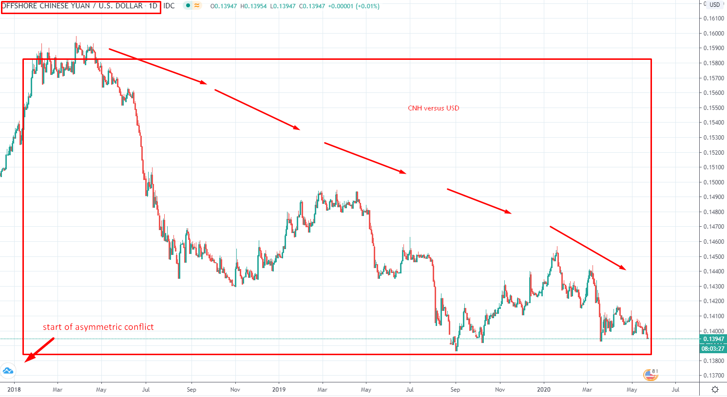 Chinese yuan/renminbi took a large fall as the conflict escalated (“large” is only relative as it is unusual for the growth that the Chinese economy is achieving for currency to take the plunge in such conditions it can only be due to outside pressure). In high growth economies where the inflation is relatively under control (relative to growth % rate yearly) the currency should not weaken. However, conflicts have the power to flip the equation around.