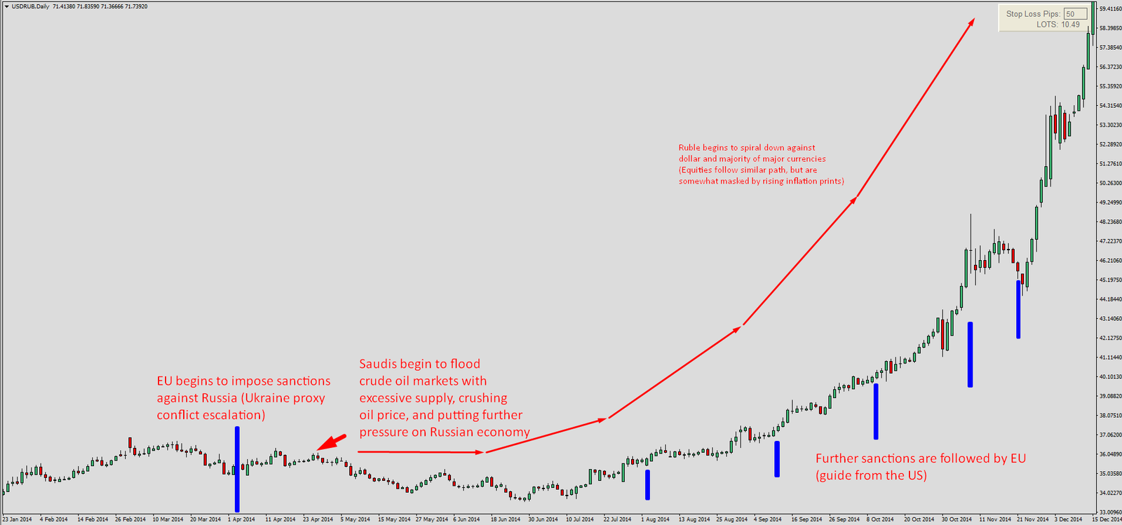 The response of currency was severe and inflation skyrocketed, all of which provided the solid shorting opportunity on the ruble itself (long USDRUB).