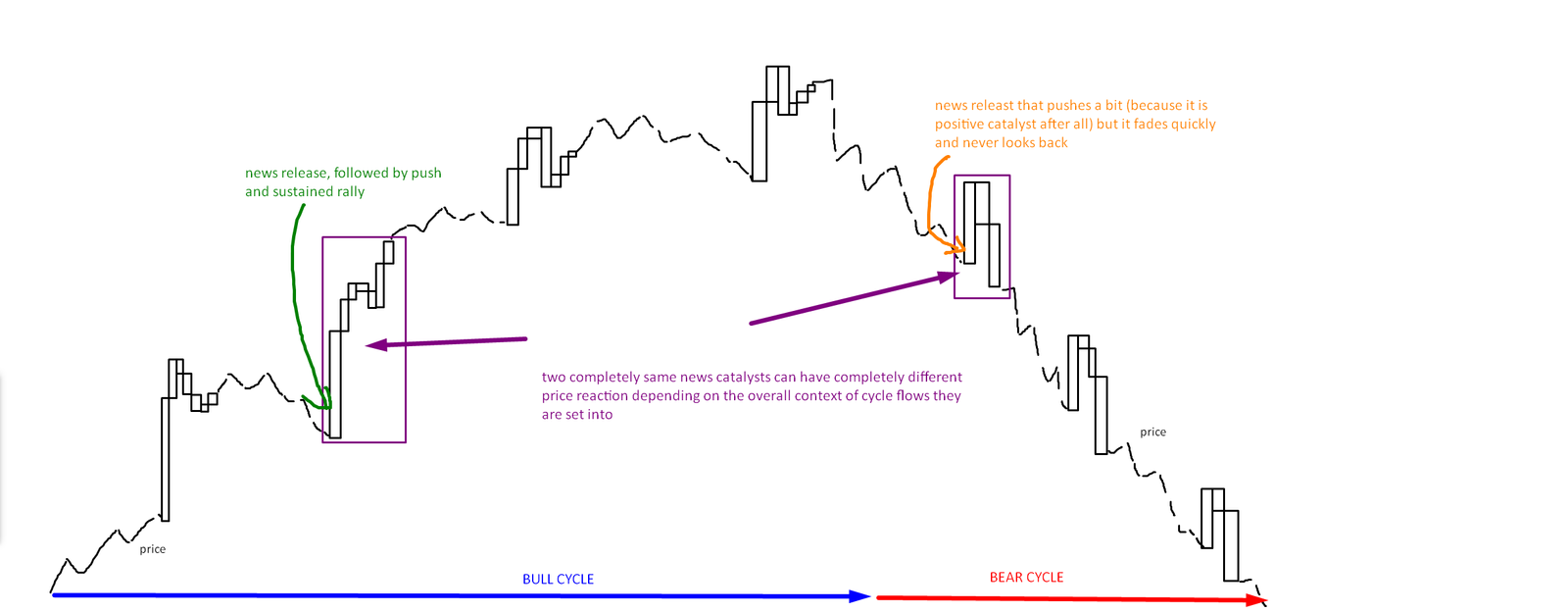 The quicker the market cycles shift in asset class the more surprised and caught off guard everyone will be because it takes higher adaptivity skills to recognize it ahead or realtime. That is why for example studying news effects on assets is much better done in crypto markets rather than small-caps because crypto cycles tend to last a year or two in the cohesive singular cycle, while small-caps tend to flip flop from strong to weaker cycles all within just two months. to strengthen all the points made above in the article therefore it is highly suggested for one to study crypto markets in bull cycles and bear cycles on similar news to see how much price reaction can be on pretty much the same catalysts. The same concept will then apply to small caps but like said, small caps are not the best training ground to learn this concept well, it’s more challenging.