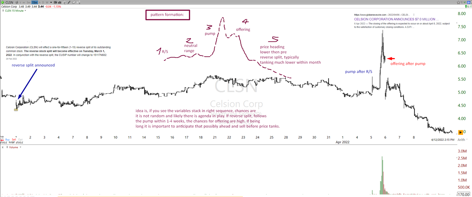 This is why playing the long side of the reverse split is only one portion of the picture, and playing the short side after the pump of it is the only second piece. A much better approach is to understand how the play can be structured on both sides if conditions align with the potential offering on the ticker. The pattern outlined below is relatively frequent if everything matches the explained conditions well. Therefore the edge is on both sides, but the agenda becomes especially clear only on the short side if everything matches the potential offering. Ticker CLSN is such an example of offering play on pumped reverse split ticker.