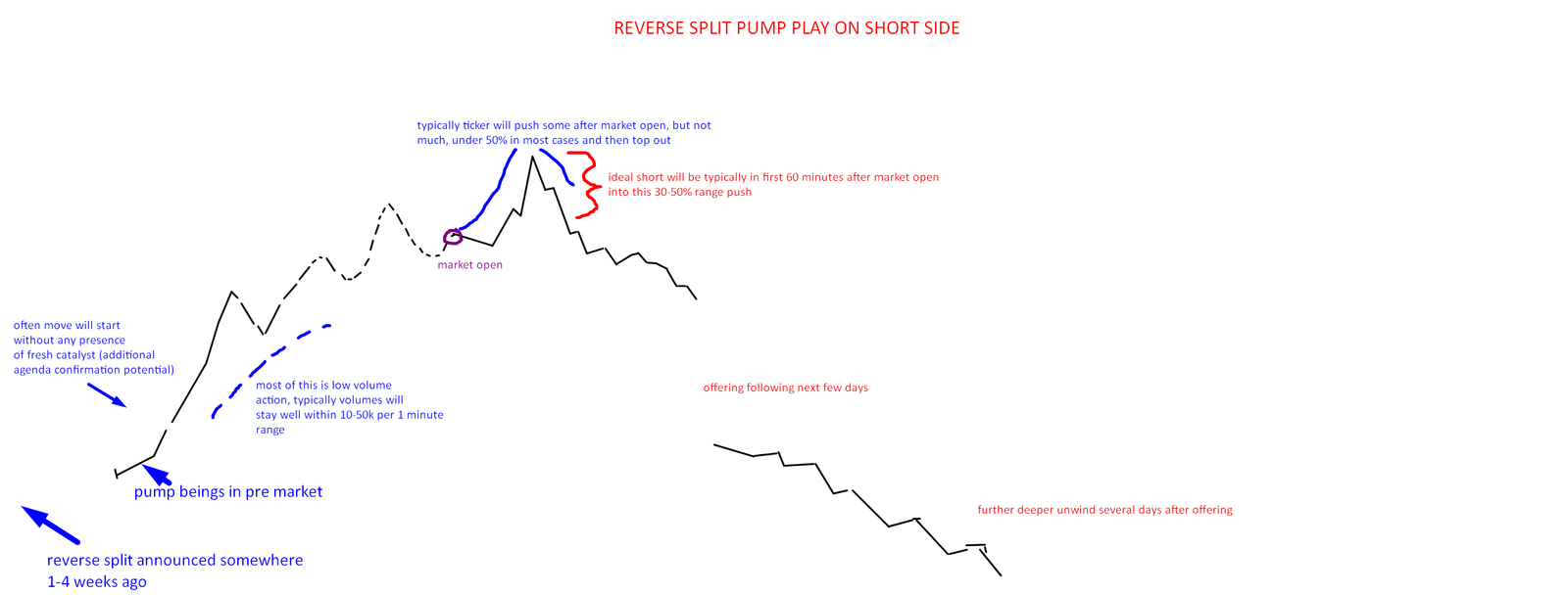 It is much more straightforward to just wait for the company to announce a reverse split and then go long into the expectation that stock will push somewhen soon, versus building a short edge which requires patiently waiting for the ticker to start moving first and then researching its typical behavior to even figure out where its best price to start short position.
