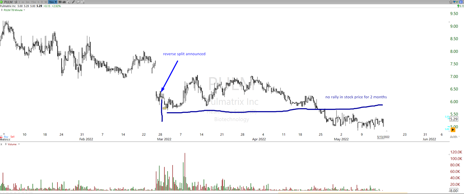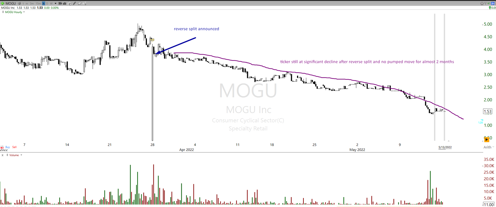 On the images below are three recent reverse split tickers, none of which had pumped moves after splits and have all declined substantially after the split was implemented. The simplified method of “just long reverse split ticker because it will get pumped probably” is therefore often a failure. Or at least it is not as simple as it might sound. The key is not that edge cannot be built around it, because it can be, it is to highlight that selectivity and better-defined context are needed for higher accuracy. MOGU, PULM, and AIHS as examples.