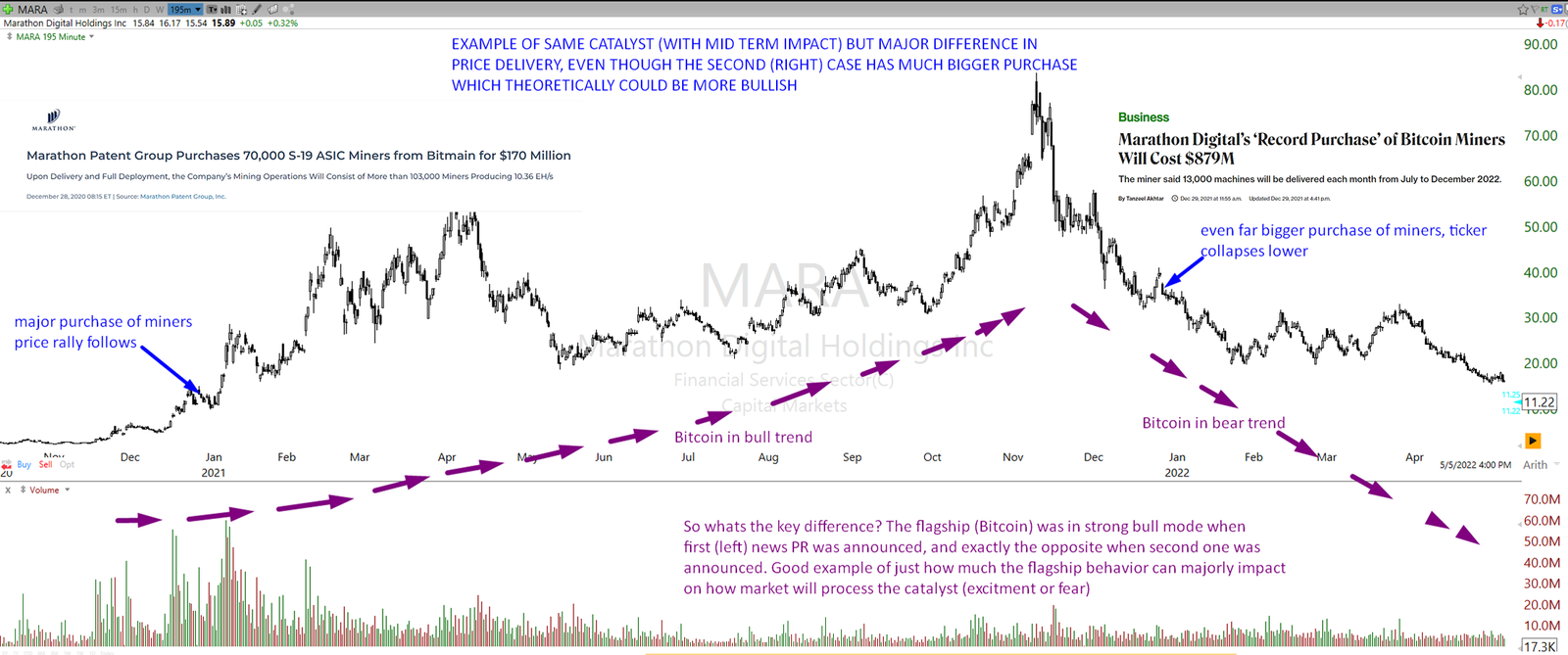 So traders like that get often caught in surprise when they use this method to anticipate what ticker will do on the current day, while not acknowledging the fact market is currently very strong and the gap-fade behavior on this day might completely inverse from what is expected historically. It’s by this where short-sellers tend to get burned the easiest. It is why understanding past cycle context vs current one is absolute key. And the same goes for long investors, they get trapped in the next gap ups anticipating the ticker will run this time just as much as it did on the last 500% rally, without understanding that current cycle conditions are far weaker and is just most likely not going to happen. That’s how many longs get trapped into bagged positions. And this becomes especially when news are added into mix because people will build even stronger biases after reading a love story around their traded asset. It increases blindness.