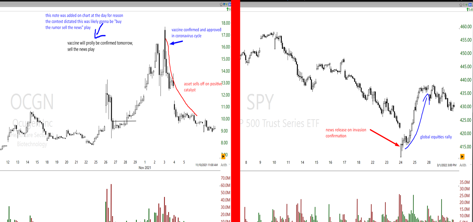 Often strongest news can result in a complete selloff (OCGN vaccine approval in November 2021) and the weakest news can result in the strongest rallies (2022 March bounce of equities on Rus/Ukr invasion). What truly matters more is context, more than the news itself at least.