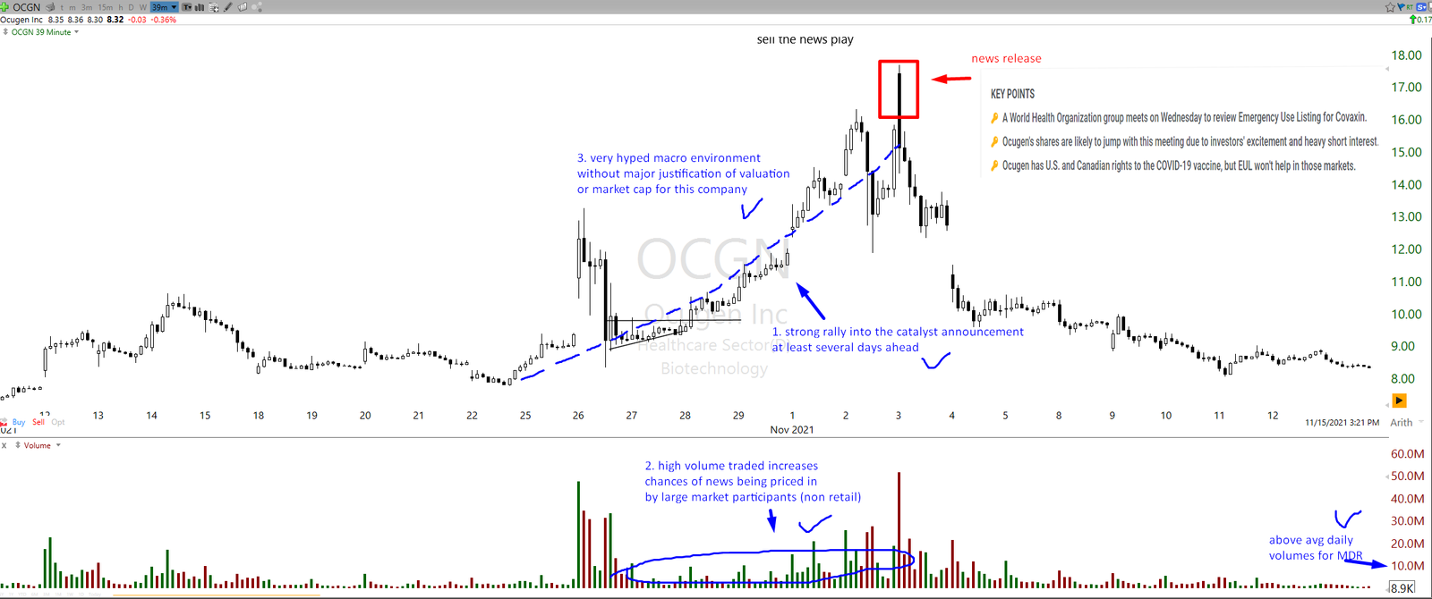 A typical checklist procedure of trade on “buy the rumor sell the news event” is outlined on the image above for OCGN, those are key factors personally used, but one could probably find other ones in different niche too.