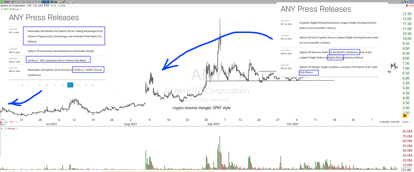 Example of ticker ANY that flip-flopped the two sectors, but the market still bidded the ticker, regardless of how this might impact the stability of the company because the hot sector of crypto was the strong flow at that time. This shows that it