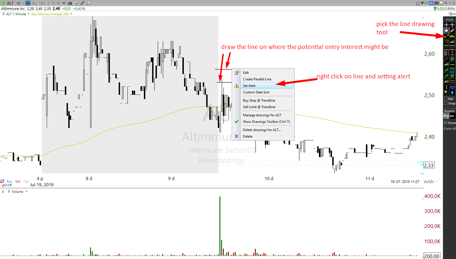 Below is an example of alert use on equities (in the case of ticker ALT, there was interest for short entry around where the alert lines were set). Once the alert is set, a trader can move forward to some other asset. Anyone can try to use this method and shape it differently to fit it to personal preference to decrease opportunity costs in trading.