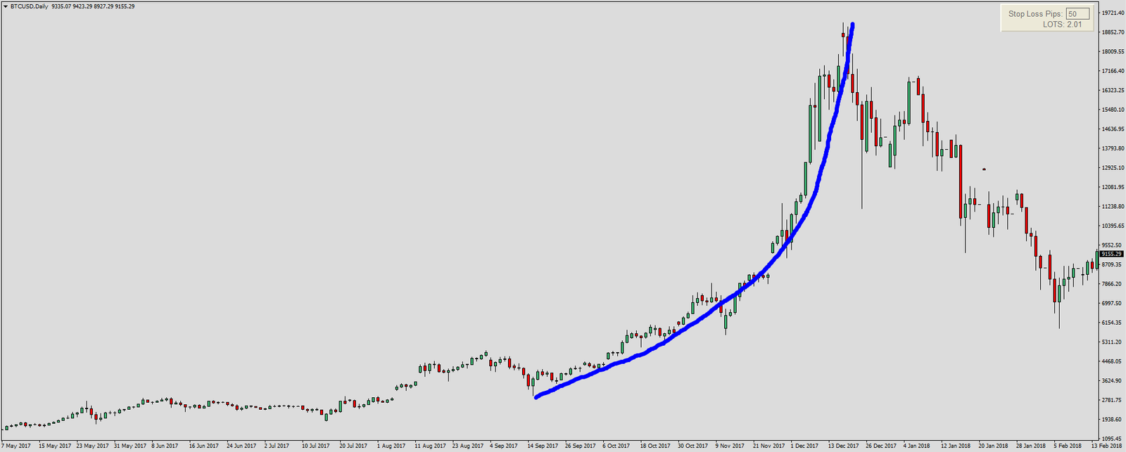 Using the above principle, on Bitcoins parabolic rally of 2017 as an example, looking at the same move from 2 different time frames, wherein first case parabolic curve progression is visible, while in the second it no longer is visible due to too little data/candles it starts to become just a steep linear progression.