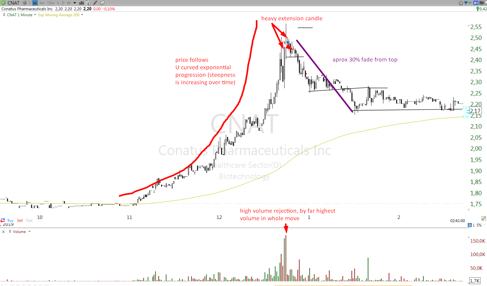 Example of parabolic extension on ticker CNAT with heavy extension candle and topping on it: