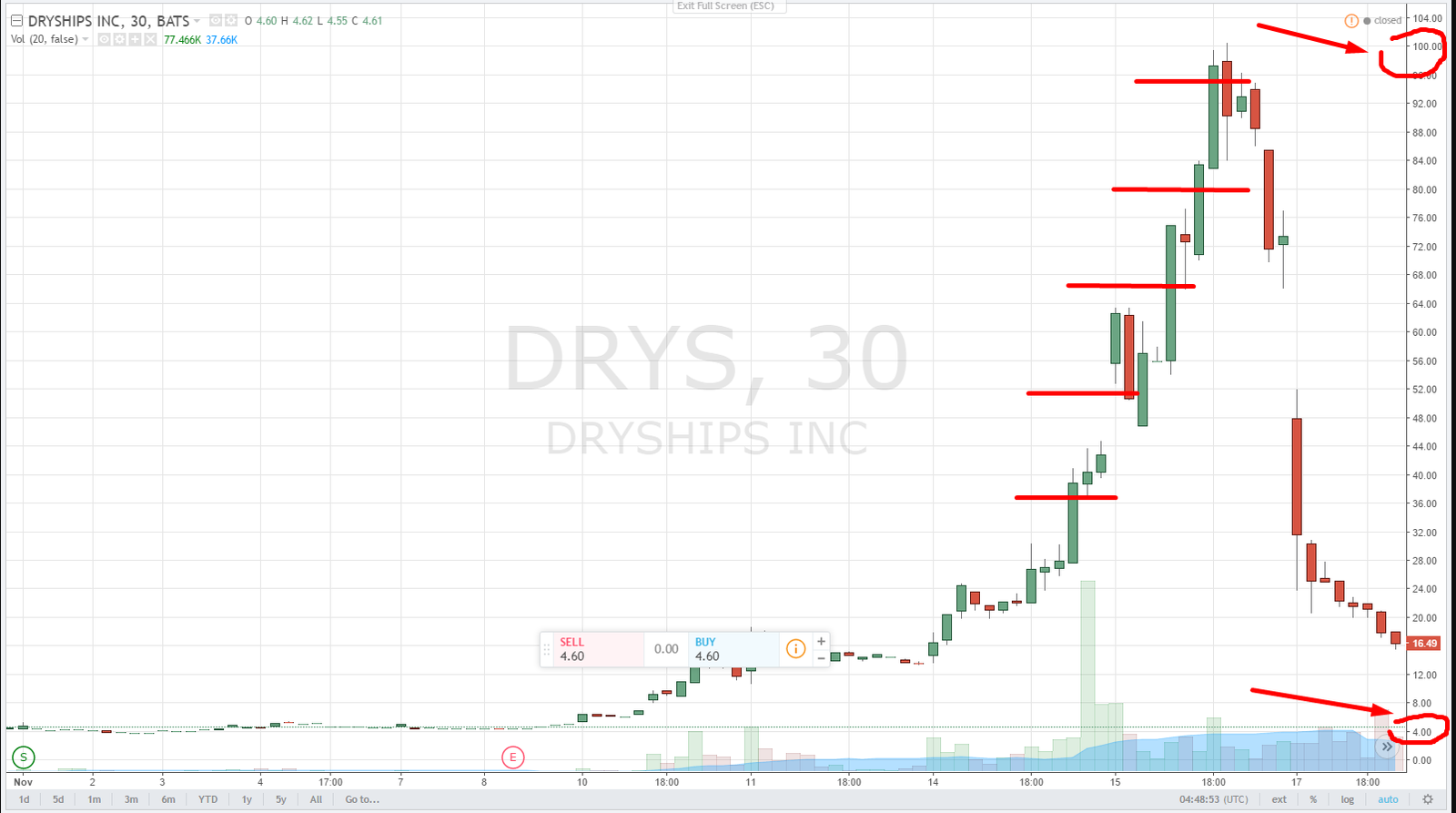 An additional example might be where specific extreme short positioning and constant squeezes cause parabolic setup to keep extending and extending, such as ticker DRYS in 2016. This is an example of an asset that went up 100%, then another 100%, and more.
