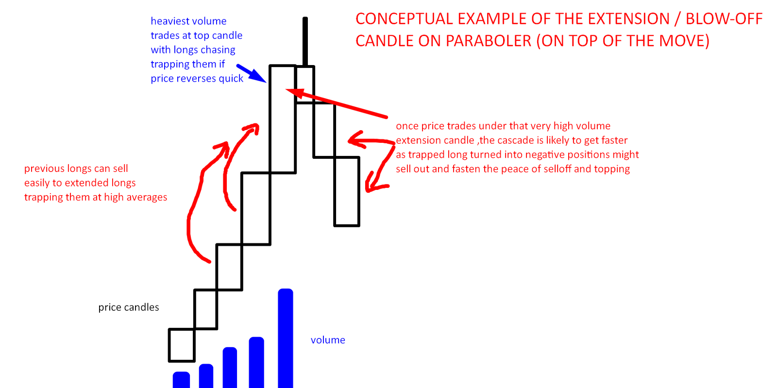 Especially for traders who are too confident in their thesis or unwilling to cut losses, parabolers might be problematic. Parabolic extensions are often part of strong liquidations. Many traders keep shorting into “overextended” assets while the top is not yet there; this can be seen time and time again. And this issue mainly comes from not knowing the setup well enough to know how to time it well or how to handle risk with proper position sizing.
