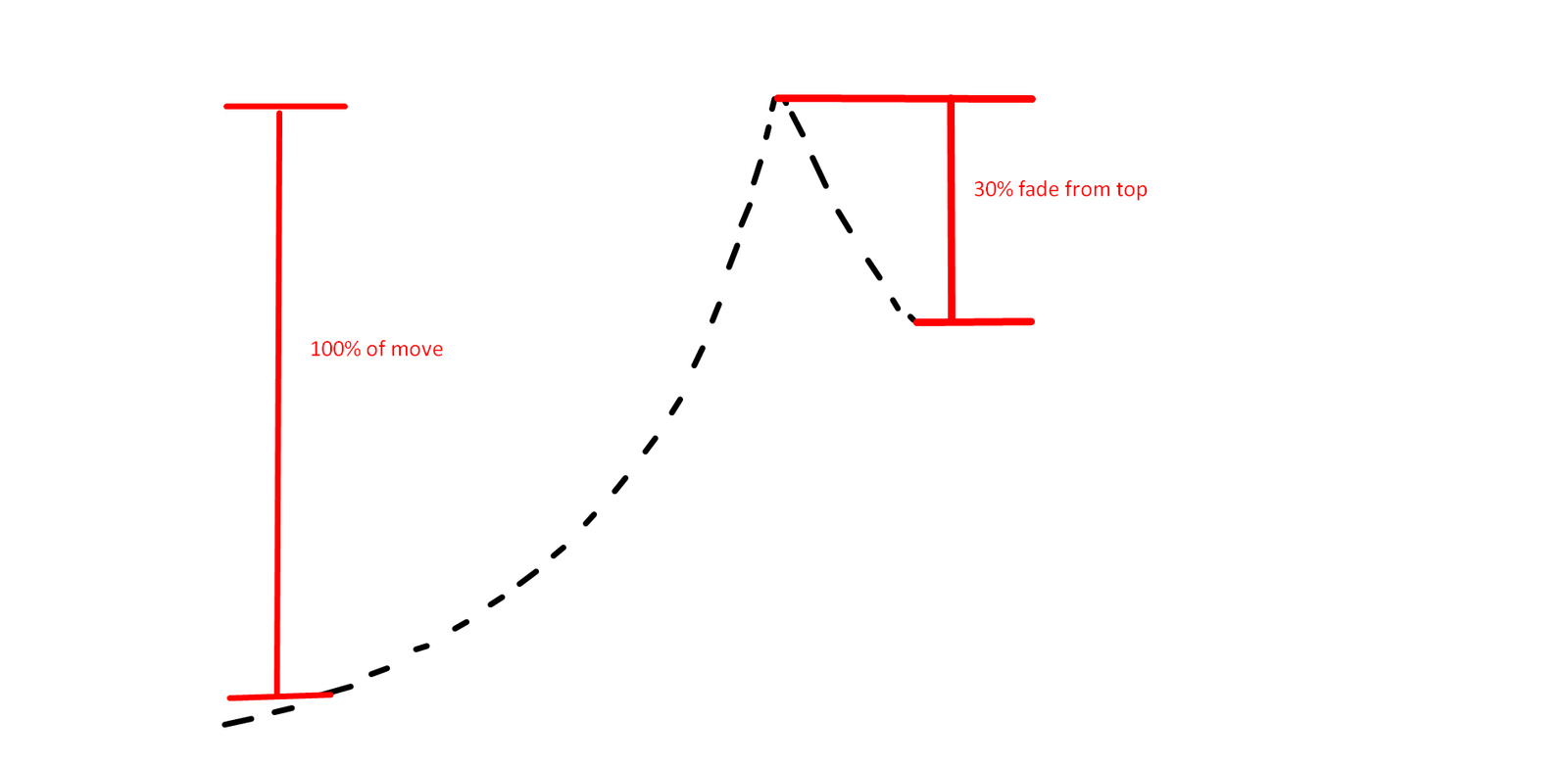 In most cases, A-grade parabolic moves will reverse relatively quickly; the rejection will be swift and fade at least 30% of the whole parabolic move. This should be within traders target, but the target could be larger depending on what drove the move; as explained in the article below if liquidations are the main cause of the move (heavy short squeeze), then fade could be much deeper than just 30% once the liquidation is done, or if the parabolic move was due to market hype, the fade could as well be deeper. But the main practical rule to follow is minimal target should be 30% of the whole move (as per collected data across many parabolic setups):