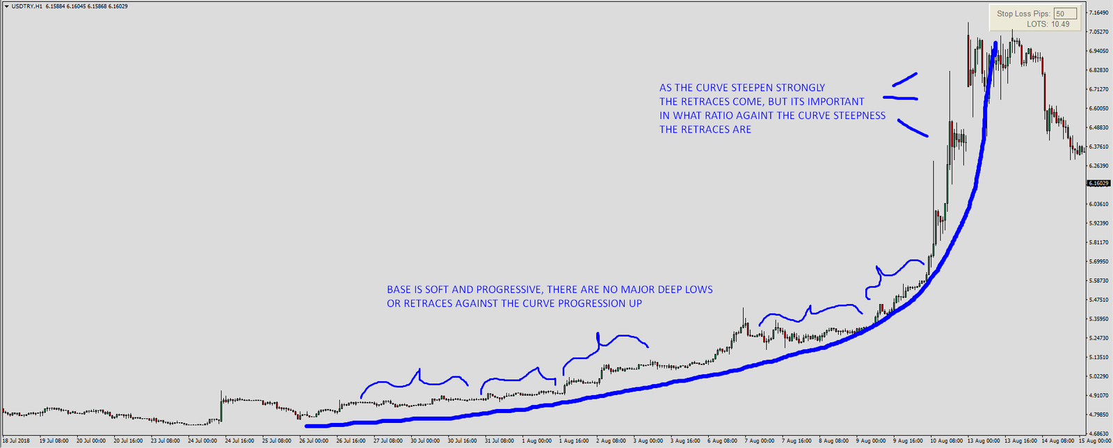 Example of what is meant as the depth of retrace between just trending move versus parabolic move on two images below.