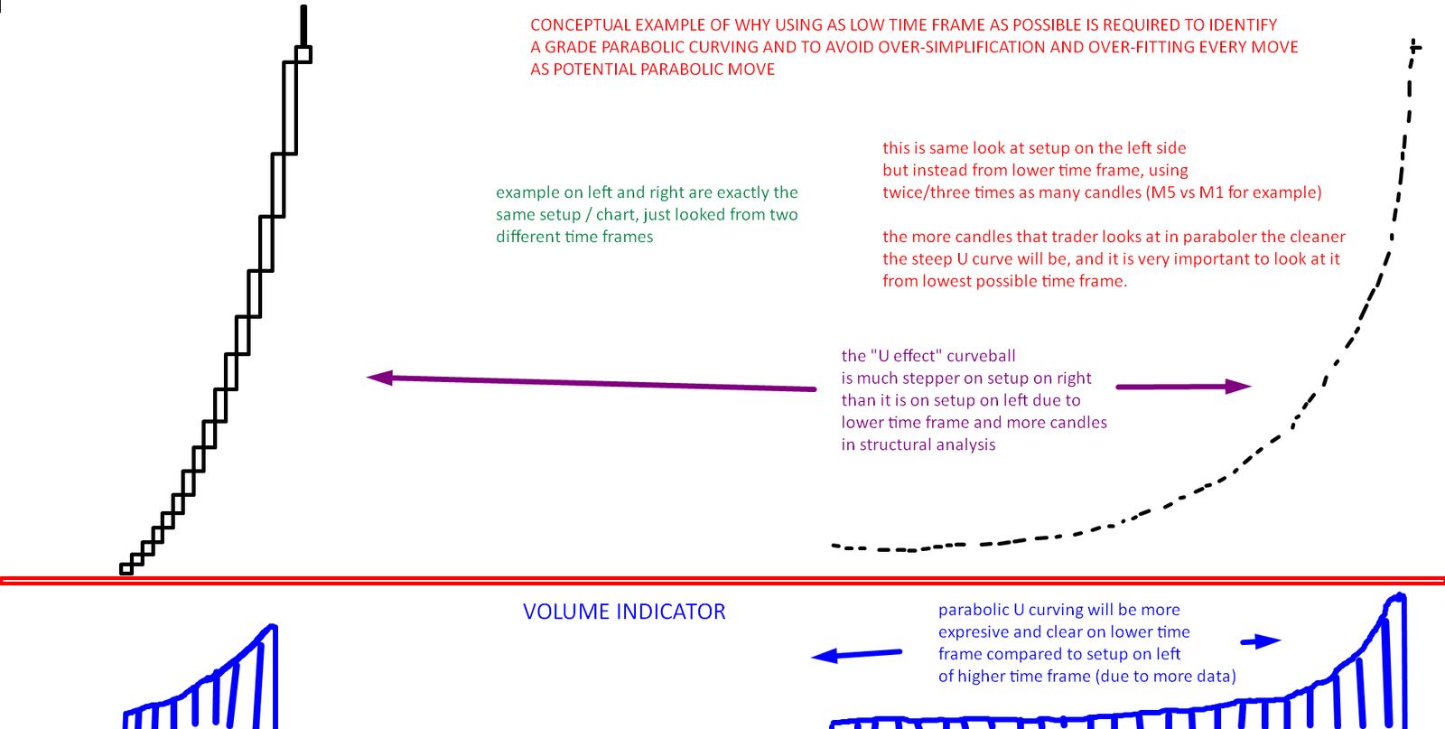 As the images show, the problem of the second image example is that both curves start to look the same; they both begin to look linear. Because when the number of candles inside the move is shrunk down, the steepness of linear move increases, but the parabolic move does not have enough data itself to stand out from the linear move, so they both start to look similar because not enough data was included. Thus it is essential to use lower time frames to define parabolic setups more accurately and having as many candles within the move as possible.