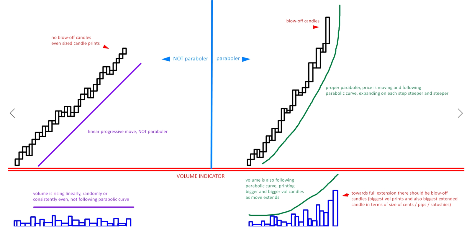 The difference between what is and what might not be a paraboler on the image below, using the above rules. Both price and volume should equally follow the parabolic progression, not just the price itself. More and more volume should be flooding the asset as the ticker progresses toward later stages of parabolic state. Thus to define an actual parabolic setup using a volume is a must; price itself does not define the extension accurately enough.