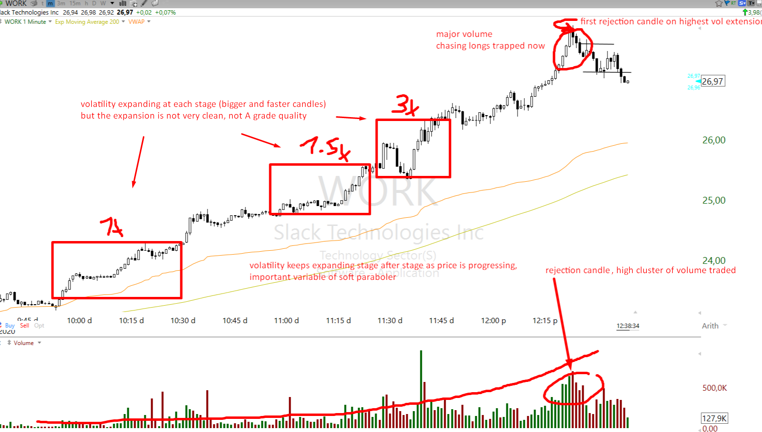 Below is an example of B grade “soft” parabolic setup on ticker WORK. The difference of this setup versus A grade setup is that the setup below has only soft U curve progression of price and volume (much closer to linear progression rather), and there was no clean high volume rejection candle at the end stage of the move, B grade setup.