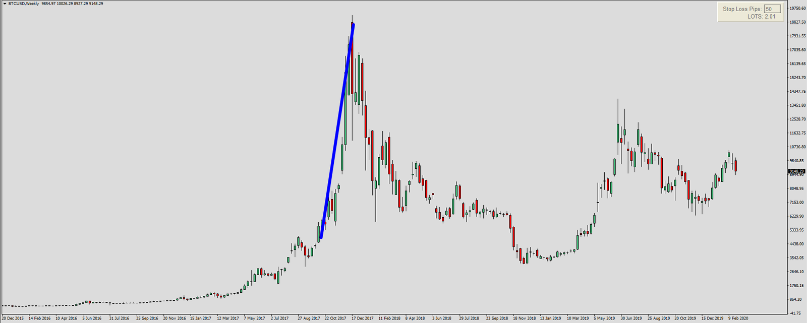 And using a higher time frame (Weekly) where the parabolic curve is not visible and instead becomes just a steep linear curve: