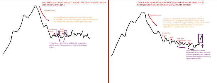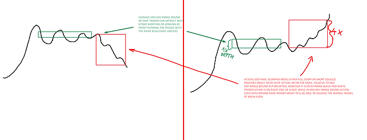 Speaking from the personal side, there are certain occasions where conviction is very strong and EOD target/agenda is quite clear, where I will be able to sit in position and be un-phased by the whipsaw moves in between. However, that is not the case in majority of times. When your thesis is not strong and you are not seeing the pattern, but you know the ticker is rigged, it will be difficult to hold through strong push-pull moves because you are always on guard for that “done” scenario, where you might end up being on the opposite side of rigger, holding for a large loss. You just never can really know when rigger will go for strong short squeeze push, or abandon the ship altogether in one big flush.
