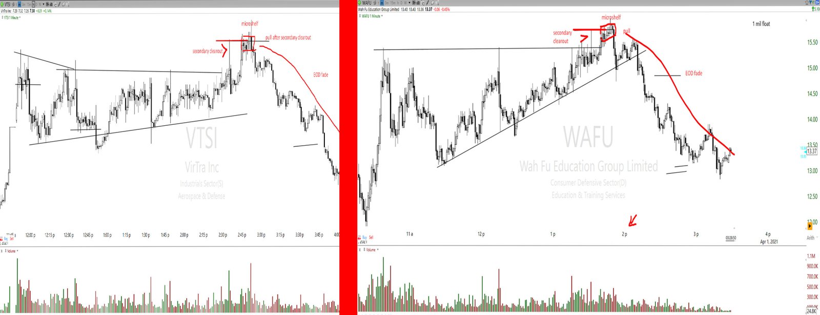 Some examples of recent Type 1 plays were tickers VTSI and WAFU, both nearly identical. Smaller floats, rigger absorbing a large amount of float, slow grind higher with HOD clearout, followed by secondary push, micro shelf, and then final “pull-the-plug” in last two hours. Both tickers are solid examples of why keeping recently rigged tickers in mind-memory is important as riggers tend to repeat similar traps often back to back.