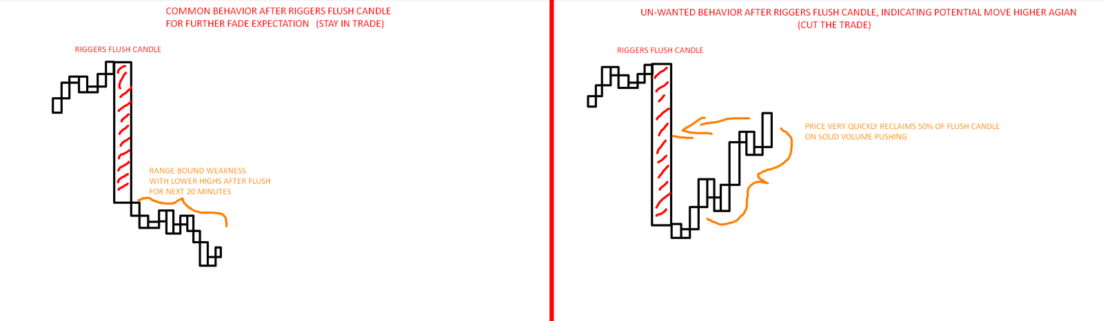 Or to keep it with other words, after flush candle, there should be the somewhat instant response of price with further weakness, usually a choppy range with lower highs that slowly then rolls over into backside fade.