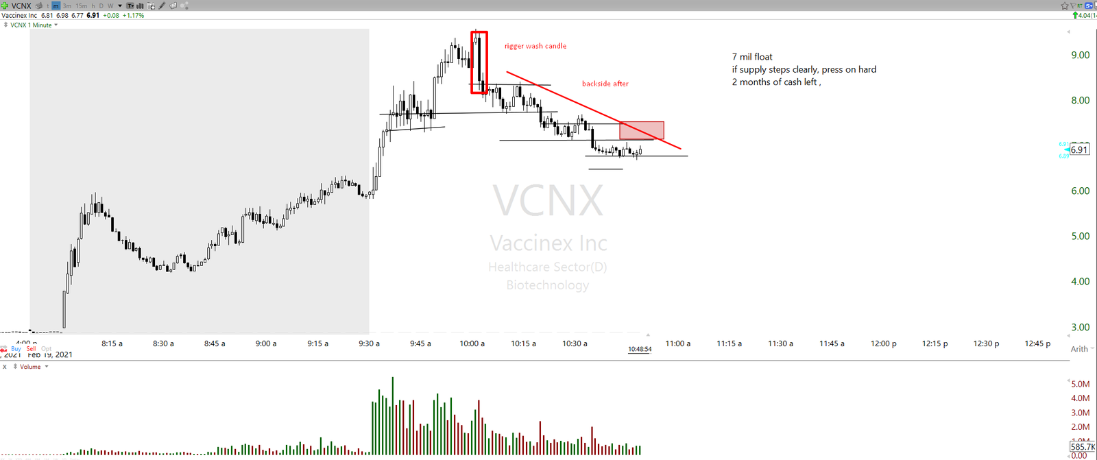 Example of rigger flush candle on ticker VCNX. Ticker has faded straight away for decent RR if trader joined short after rug pull. Ideally, one should look to short first micro pop after rug pull, and then recycle portion into washes, and placing those covers back into fresh short if new micro pop appears. Ideally, a trader should hold over 50% “alive” at all times, especially if the price is still very close to the rug pull candle (as further fade is likely). The further the price goes away from rug pull candle, the more size the should trader cover.