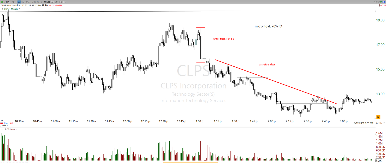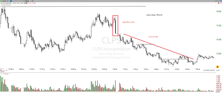 Example of rigger flush candle on ticker CLPS. Similar context to the example above for VCNX, same approach. Especially downside halts after flush candles are preferred as that fuels the selling stronger after the un-halt.