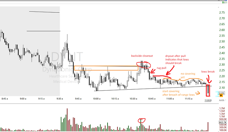 Tape slowdown and price weakness are required after rug pull if a trader wants to participate on short with the expectation of further fade.