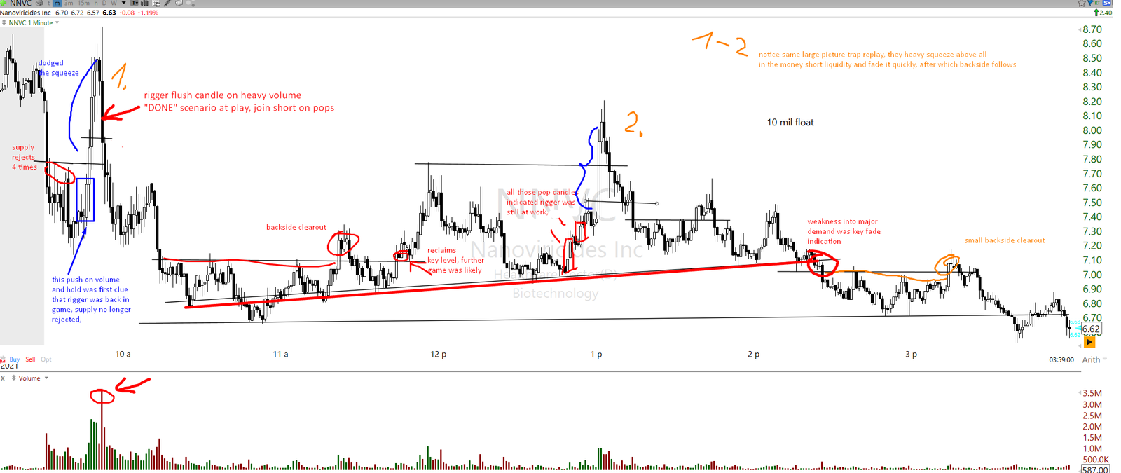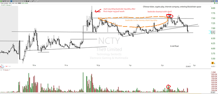 One should trade and practice this on either a very small size or simulated account, there is no need to be engaged in behavior or pattern that you are still just learning or find very difficult, make sure this is prioritized well (rigged tickers can often be the most difficult to trade). It is just too easy to get annoyed on rigged tickers if using large position size, getting in a fight with asset/rigger, having poor read, and then ending with a deep loss. This happens all the time on such tickers because traders do not pick the right learning path on such tickers.