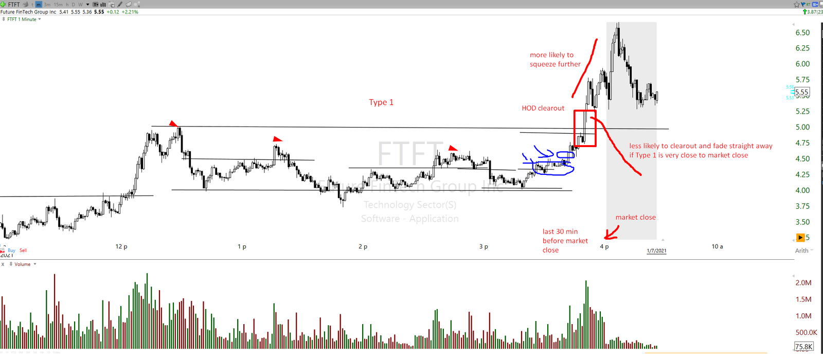 Such example of Type 1 HOD clearout in last 20 minutes on ticker FTFT, where the ticker went straight trough clearout level and further above: