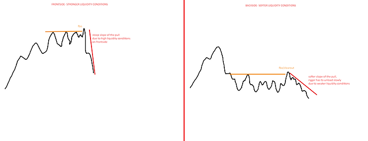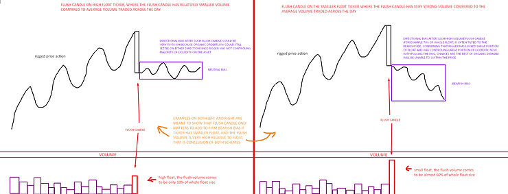 But since one can never know if the rigger will still absorb the liquidity back (re-accumulate the float), the risk management rules have to be in place, for where the trader should cut the trade. My personal preference guided by the rough performance data of pattern is to cut if 50% of the flush candle is reclaimed with a decent amount of volume (relatively quickly). The quicker the price reclaims that flush candle with the more volume, the more inclined the should trader be to cut short, because chances are rigger is back-in-play.