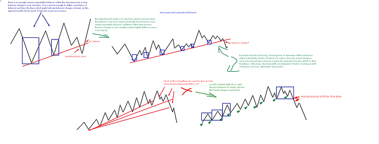 Also, keep in mind, try not drawing trendlines too much to spot key behavior change because often price structure will not be symmetric enough to draw the consistent line, instead focus on the repetition of behavior itself, when the current behavior is no longer inline to previous, using the flow of highs and lows and the initiations/pulls as a guide (use volume as well):
