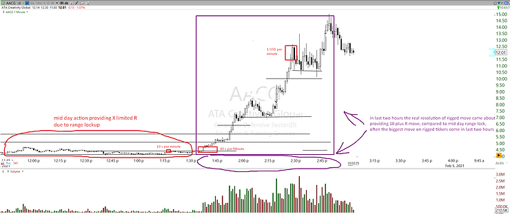 To increase the playbook size, and to learn the traps one should be observing ticker as much as possible and trying to participate as much as possible (but not from the get-go, do it slowly, expand your participation rate bit by bit, as the months pass and your experience with rigged tickers grows). By only taking a single entry on ticker one will not get in-sync with riggers actions and patterns, it should be traders goal to try to sail along with the rigger through the day as much as possible. The longer you are on the right side, the better your read on the game will be over the long run, and that is exactly where the R growth on such tickers will start to expand strongly. Because with only taking a single entry on the rigged ticker, one might extract 5R give or take, but to get into the area of 15 or 20R, one can only do that by having multiple entries and recycles through the day. And surely yes, this makes the whole trading a lot more stressful, difficult, more likely to lose, but this is the recipe in how to increase the read-rate and Rs on such tickers (R standing for risk unit).