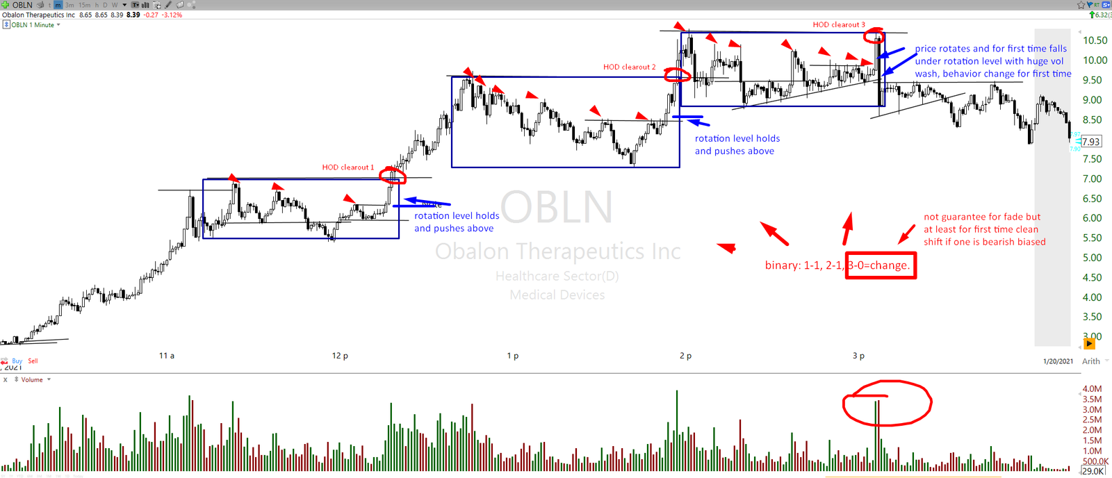 Example of rigger flush candle on black swan ticker OBLN after 3rd HOD clearout (providing decent backside play after that). Again, ideal behavior after the flush candle is a smaller range with lower highs around which trader can short into micro pushes and cover into micro washes while keeping at least half of the total position size “alive”. This kind of flush-range-further fade behavior is often present and provides a solid way to extract 3R just in the first 20 minutes after the rigger flush candle.