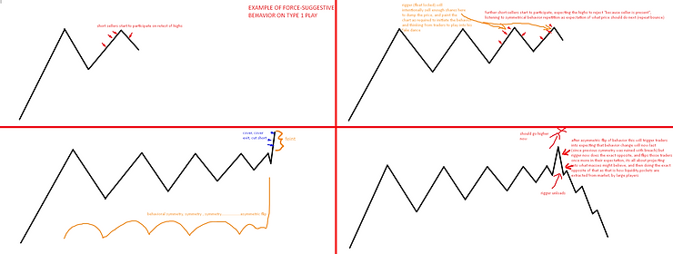 If you took all that was said above or shown in videos and ask yourself: How is then this rigging activity playing against me as a trader? Riggers intention is to pre-disposition trader towards the symmetric dance on the asset because the “painting” of symmetric behavior is what rigger will use (just as the video on Mordhau shows as an example) to force-suggest trader on where they should stop out. Once the behavior is repeated enough times, the traders get used to further expect the same behavior to repeat and usually the stop losses or the panic-exit actions will be at the exact opposite of that symmetrical behavior expectation (basically traders will stop out once the symmetry is ruined with violent move – invalidation) which is exactly how the rigger will play on creating that “panic feint” move (without traders realizing they are sucked into the lure initially before such move acours).