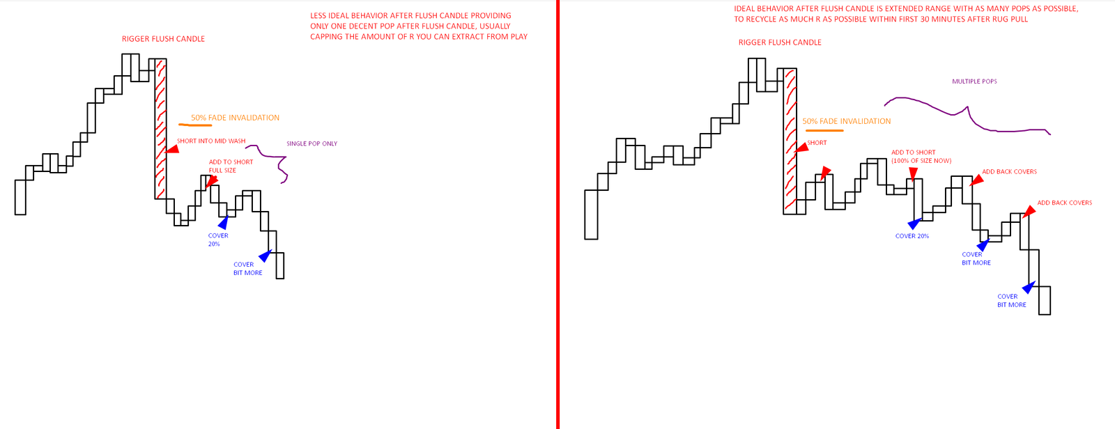 My personal preference is to short at the midpoint of the flush candle if I am already anticipating the rug pull and the tape/volume confirms proper rug pull, and the rest of the size on short position is then added at first micro pop. Once the rigger flush candle is baked, the plan is to wait for a smaller range to build up, and then build the rest of the short position (towards 100% of the size) within the higher expected portion of the range. The range highs should not exceed 50% of rigger flush candle, revert to the explanation of the article above, where the invalidation level is for this play.