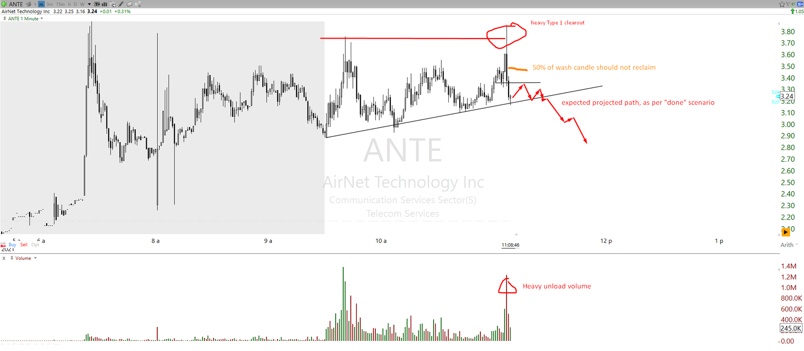 “Done” scenario at play on ticker ANTE after Type 1 HOD clearout rigger flushed heavy size, at that point trader should create expectation plan for backside fade and how to approach the short position, setting alerts at specific price locations if needed, and recycle the short along the projected fade path: