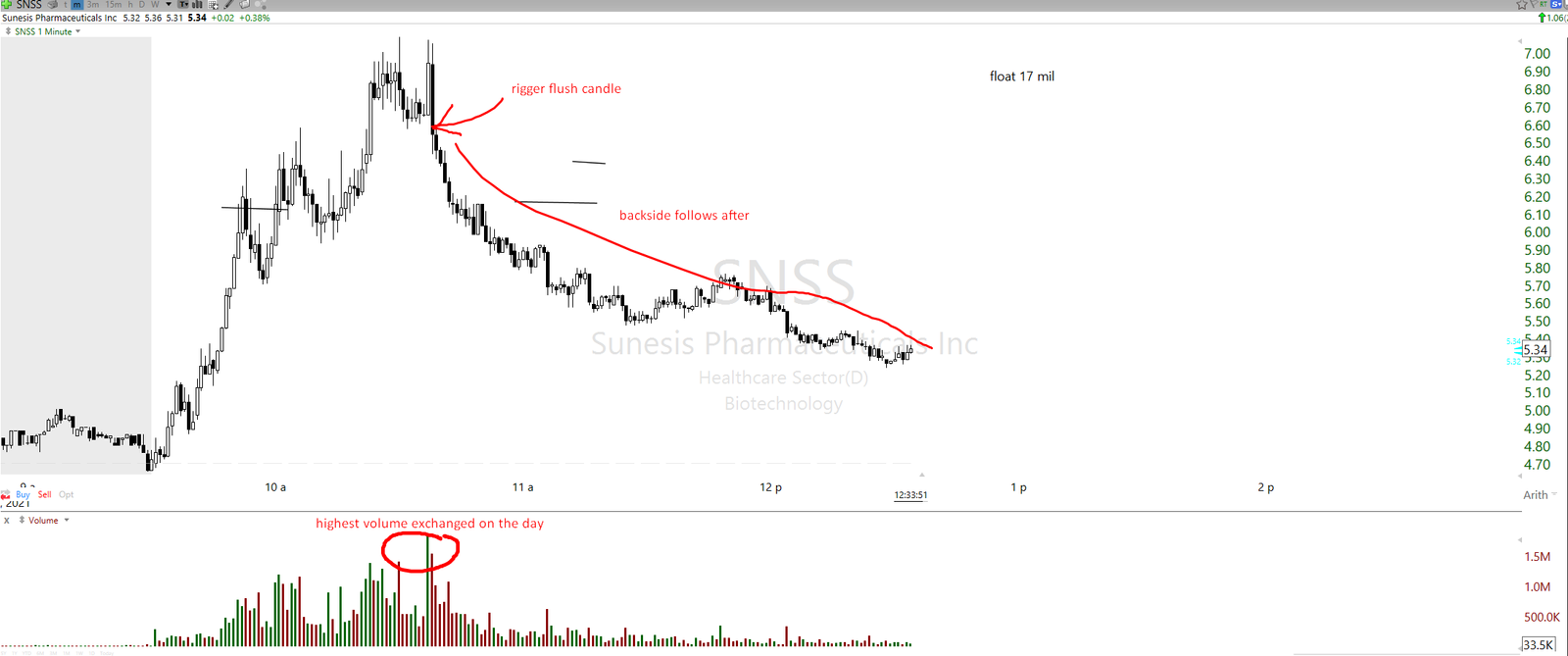 Rigger flush candle example on ticker SNSS below. In this example there was no micro bounce after flush candle, the ticker faded straight away. In certain cases that will happen, and the trader will be unable to recycle position for higher RR, or even to enter short in the first place. But that is okay, not every play will provide an ideal entry opportunity and will need a skip unless the trader has a specific approach to deal with that.
