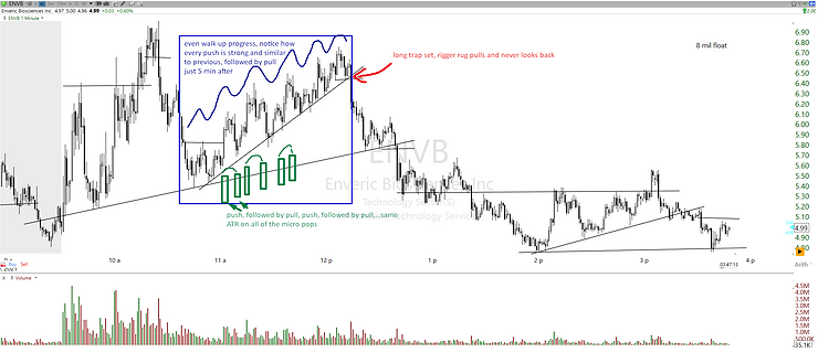 Lets take an example of such long trap on rigged ticker ENVB from March: