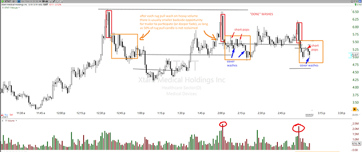 Similar example on ticker XTNT where trader can short the pops and cover washes after each rug pulls wash, the approach is the same as with the ticker TENX above, there is usually either smaller backside (3R or so) or deep fade (6R or more) following such rug pull wash. And the risk approach can always remain the same, 50% of rug pull candle reclaim is an invalidation of the backside thesis. The key is, one can never really know whether there will be a deep fade or just smaller backside following the rug pull wash, which is why recycling of position is required, and if ticker shows any presence of rigger again to scale out or cut the short completely and re-approach after next rug pull wash if needed. On rigged ticker trader has to be adaptive, nothing is set in stone.