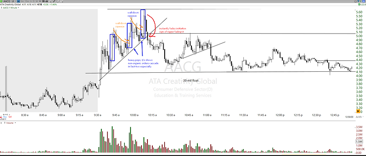Another example on ticker AACG with very even walk up and then pull soon after with price never returning to the rigged demand level: