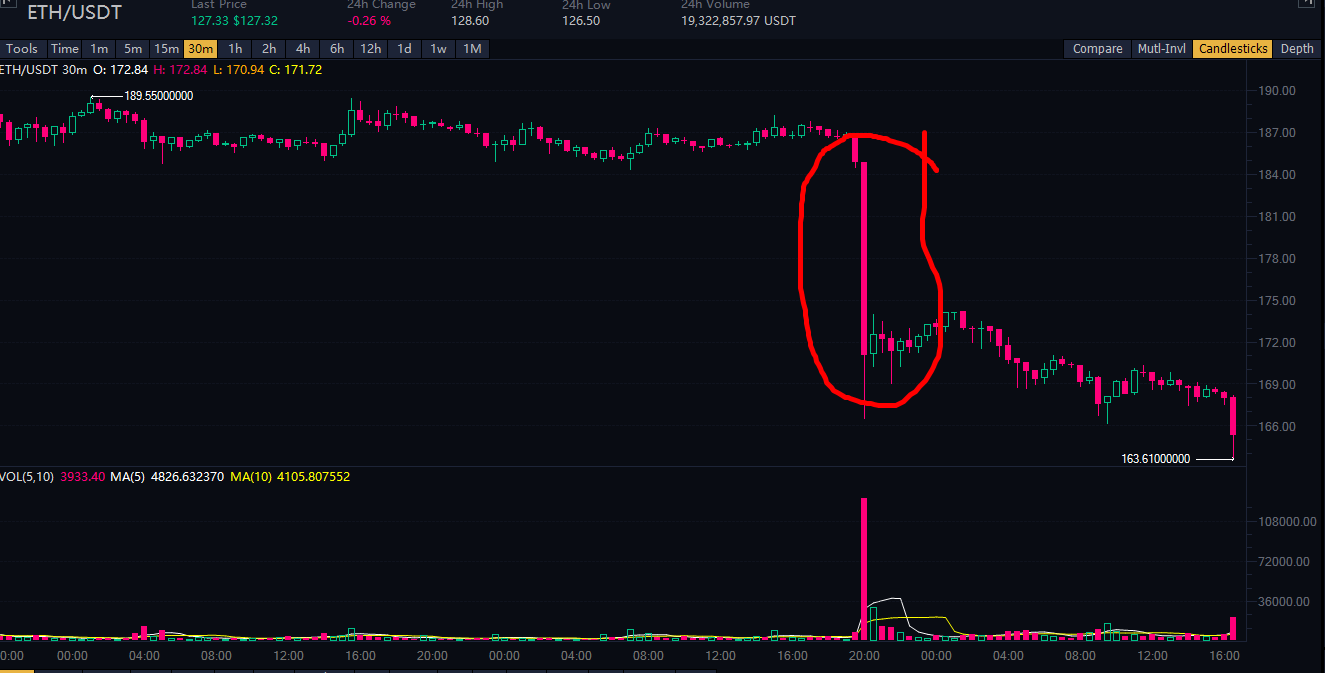 Bellow is example for crypto, such heavy drop can happen in crypto market any time, if one i trading on margin / leveraged it is thus very important to use emergency stop losses, otherwise trader might be fully liquidated.