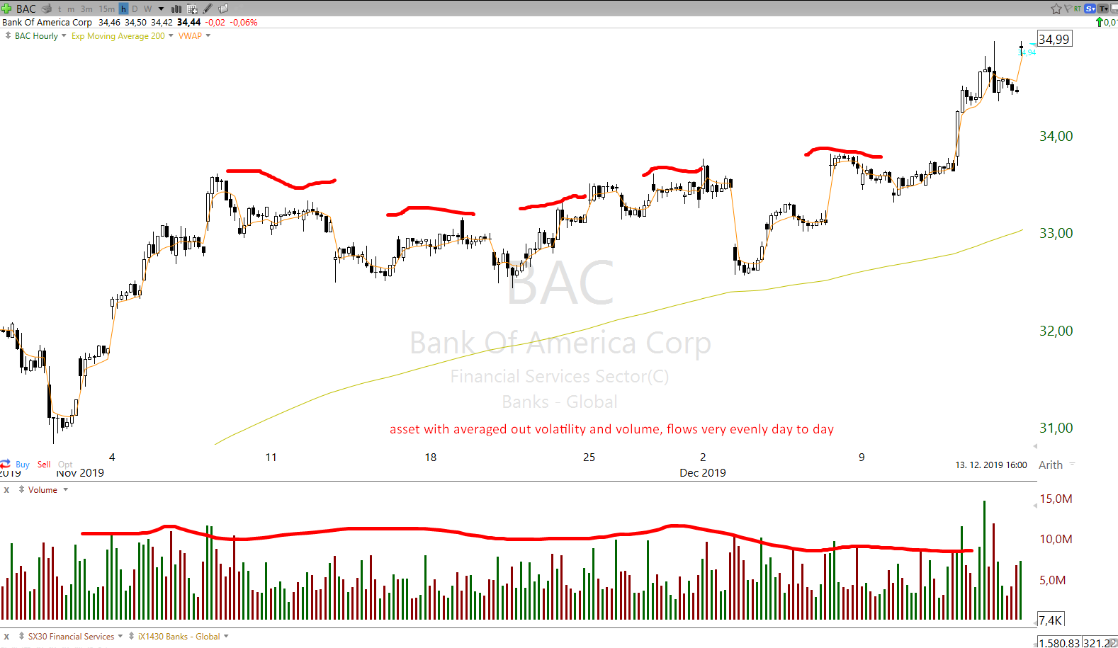 And bellow is the opposite of crypto market example above, such as lower volatile mid cap stock BAC. Such asset is not as much of need to use emergency stop losses, since it is less manipulated and has much lower chance to be hit with surprising news catalyst during market hours.