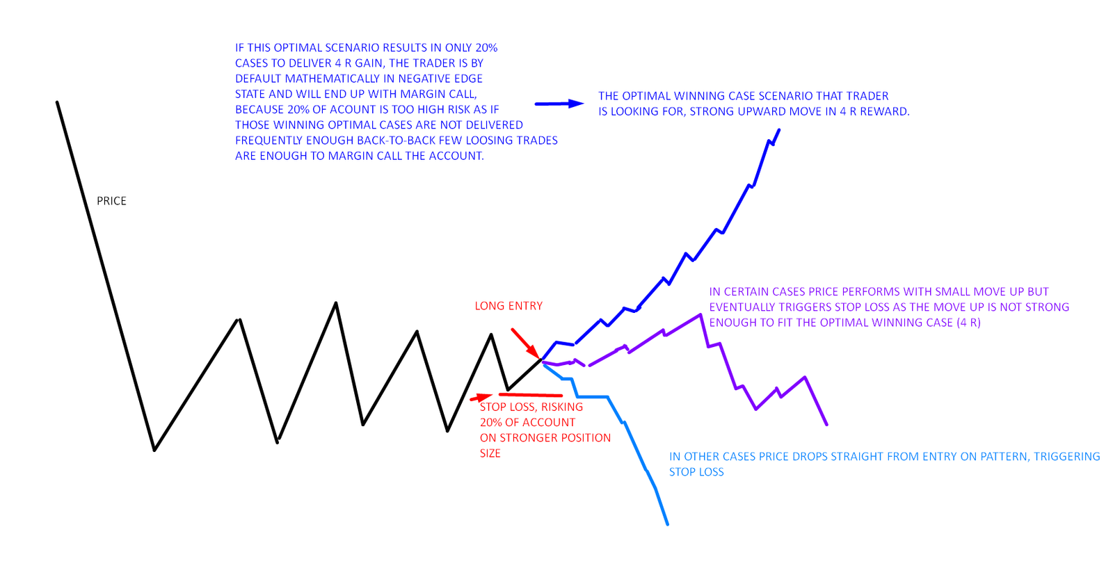 If trader would risk 20% of account (very high risk) on pattern that performs with edge 20-80, meaning that only in 20% cases the pattern performs strong move and goes into direction of trader (and lets say that trader make 7 R on average on such play with positive edge), then 20% risk would eventually trigger margin call on traders account. The winning rate of such pattern is too low to be risking that high amount of capital size (20% of account).