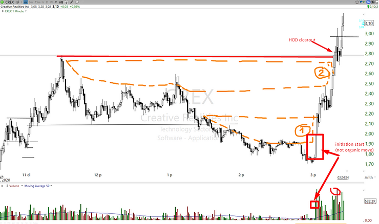 In some cases, initiations are very clear and stand out as very un-organic behavior of price, while in other cases, they are not as clear to identify. Especially the ones easier to identify are where the ticker is on the backside, such as the example below on CREX. In such case, a trader should always ask him/herself, is this price action organic result of 100s of cumulative traders or is actually very un-organic and likely the action of a single player, since it does not make sense why many traders would all of sudden initiate long at the same time, on the backside? This is one of the key questions that is rhetorical.