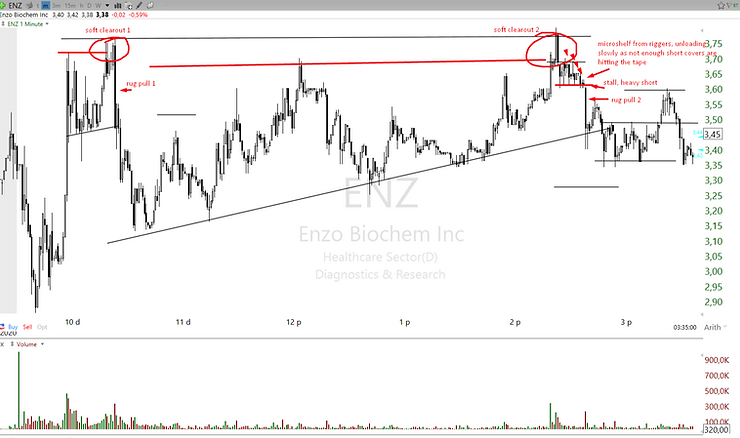 Another example of ticker with larger micro shelf followed by rug pulls afterward on ENZ: